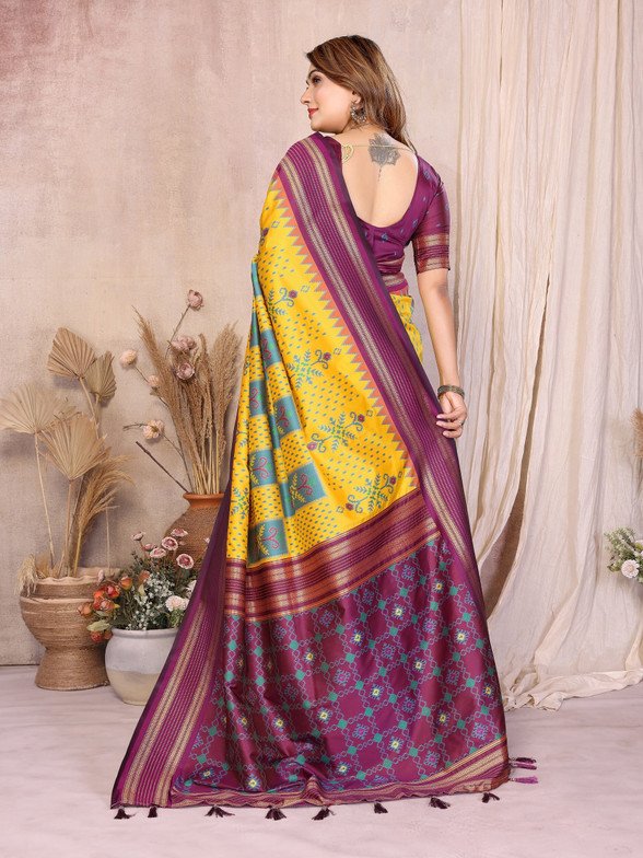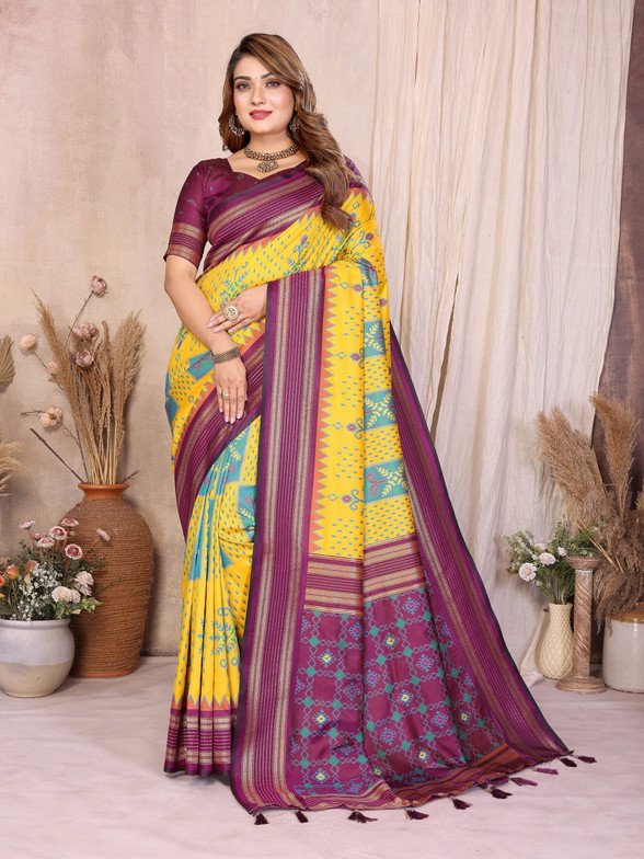 Home Festive Collection Yellow Soft Silk Ikkat Weaving Saree With Rich Zari Border